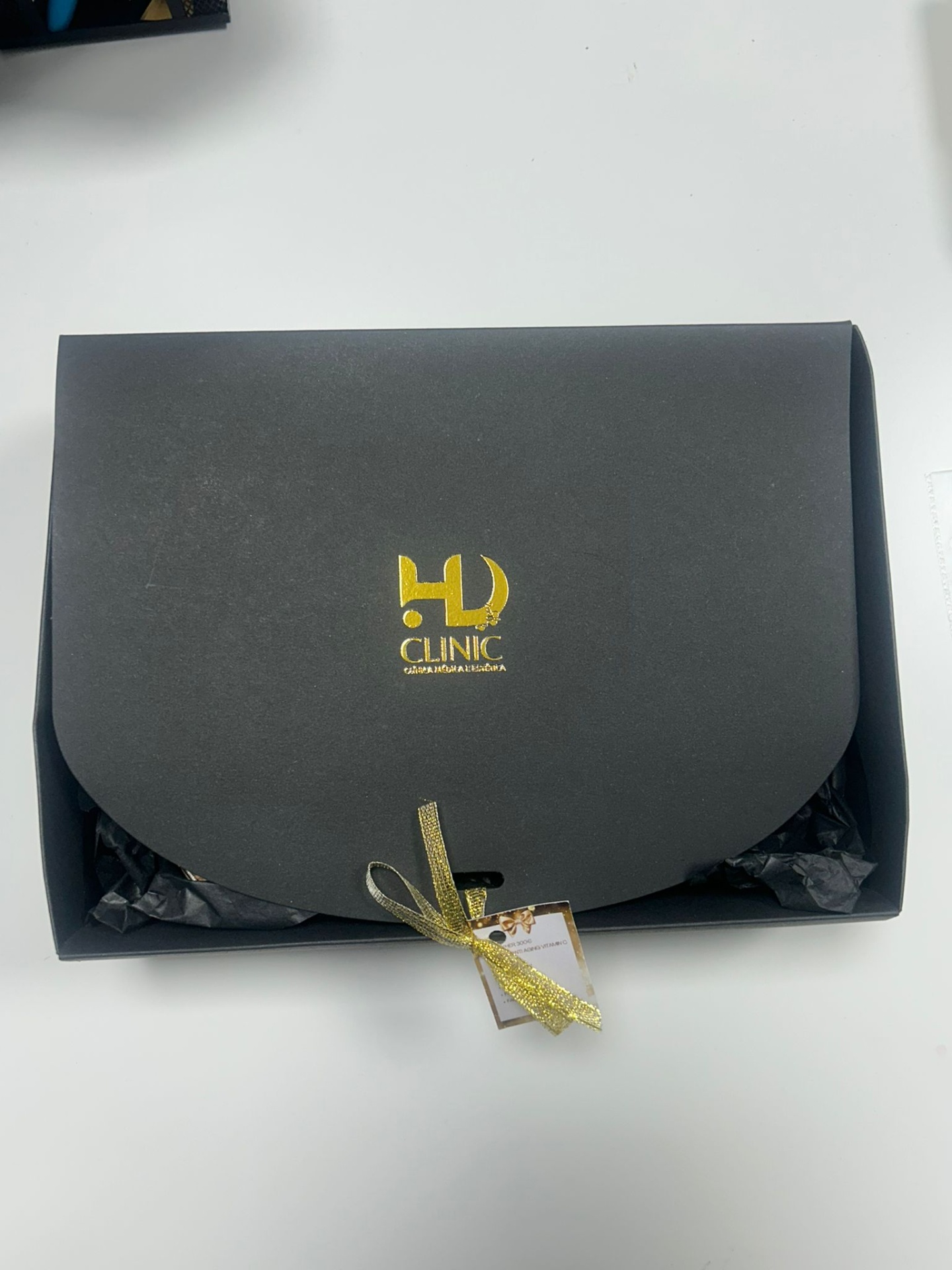 • Caixa preta com logo HD CLINIC dourada e fecho de fita dourada