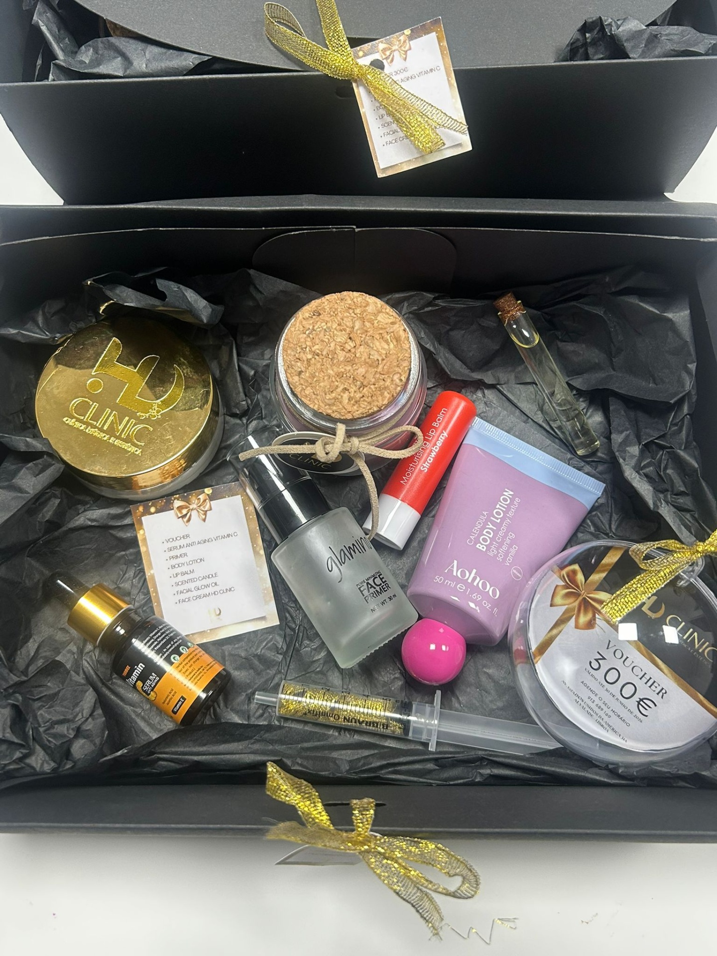• Caixa preta aberta com vários produtos cosméticos e voucher de 300€