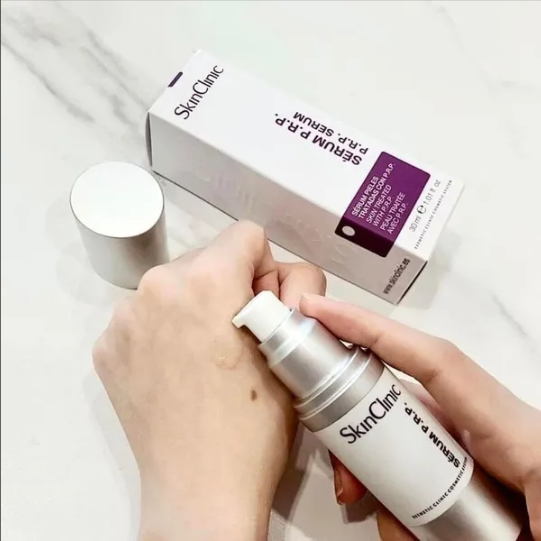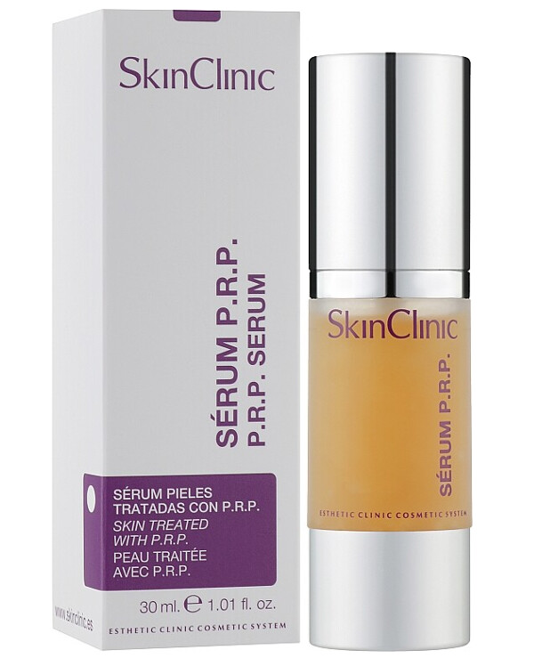Frasco e caixa do sérum SkinClinic P.R.P. 30 ml com texto roxo e cinza